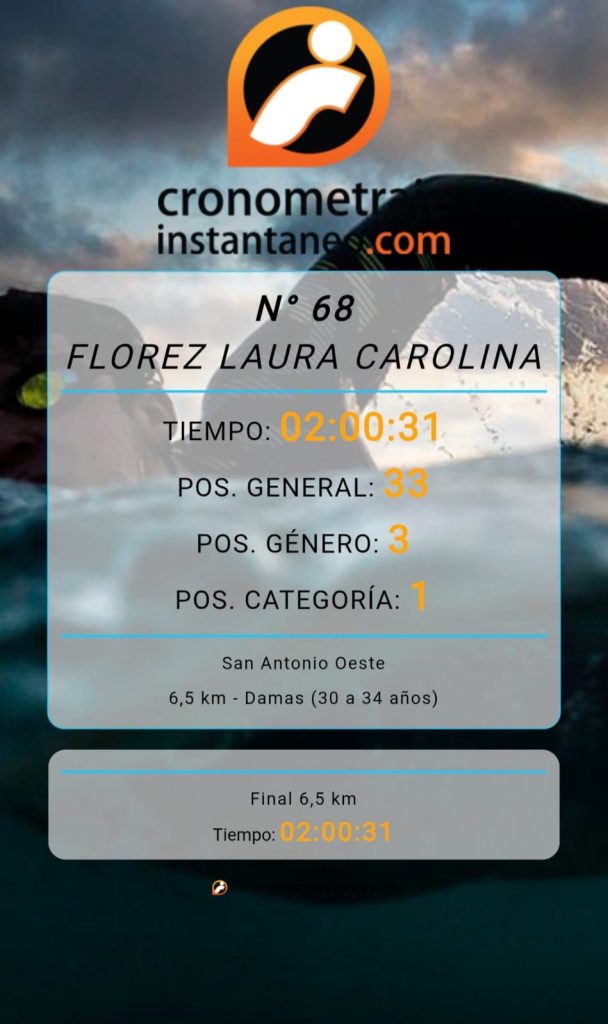 En la competencia de OWA llamada “Vuelta Huemul”, desarrollada en Bariloche, la nadadora Laura Flores compitió en la distancia de 6,5 kilómetros con traje de neopreno, logrando el 3er puesto en la general femenina y el 1er lugar en su categoría (damas 30 a 34 años). Flores registró un tiempo de 2:00:31, finalizando en el puesto 33 de la clasificación general, reafirmando el gran presente de los nadadores de la región en las pruebas de aguas abiertas.
